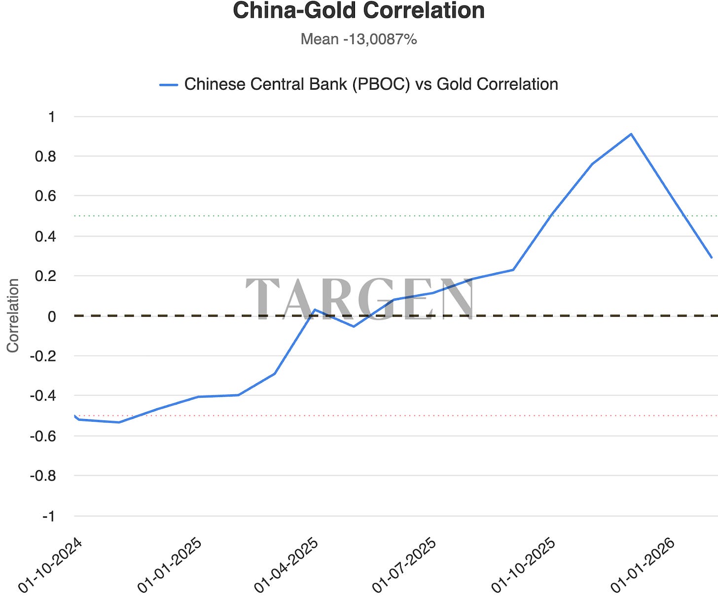 The result in gold was exactly what the model predicted. The correlation between Chinese liquidity and the gold price reached 0,9 during this recent rally — an extremely rare level indicating that PBOC flows were the primary driver behind gold’s surge.