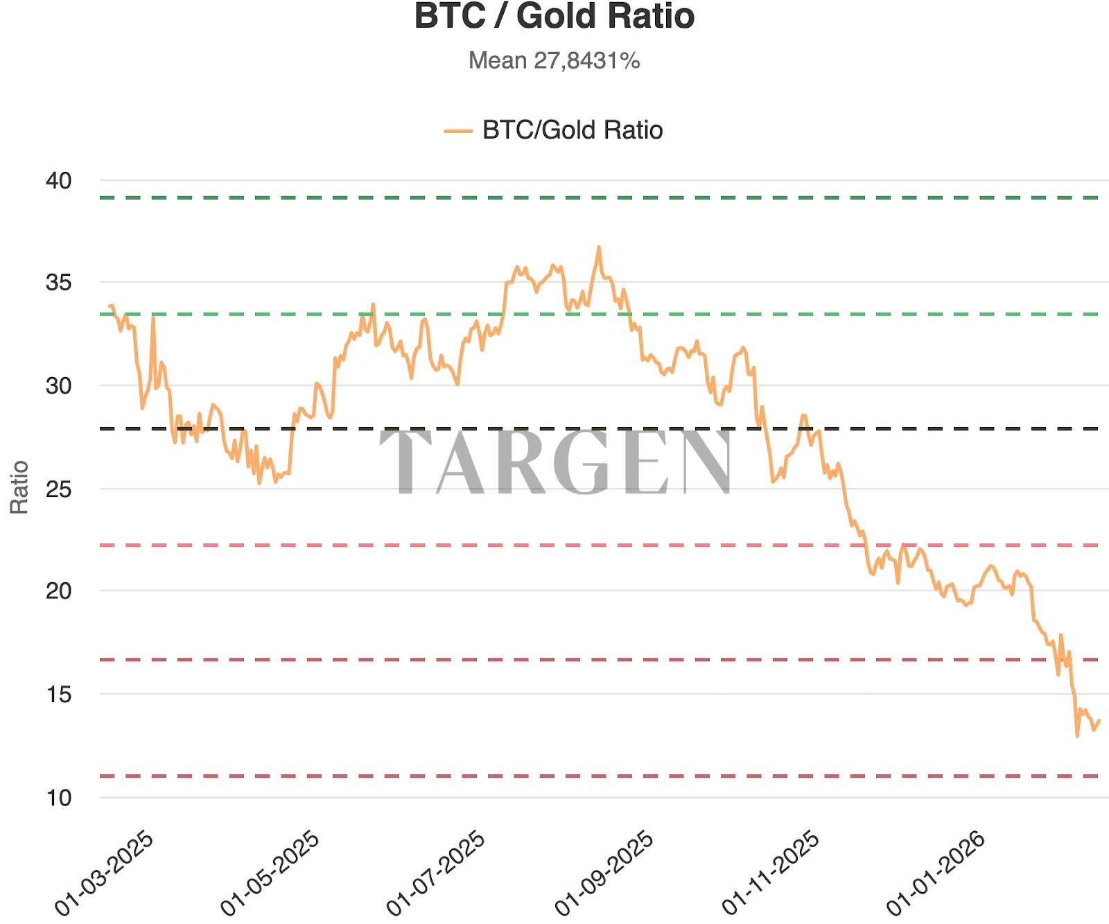 The ratio between Bitcoin’s price and gold’s price is a metric that, historically, reverts to the mean. When gold rises much faster than Bitcoin, this ratio falls. When Bitcoin surges, it rises. Over the long run, excesses correct themselves.