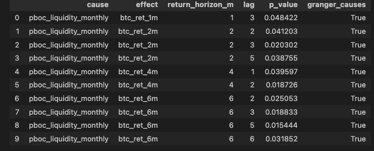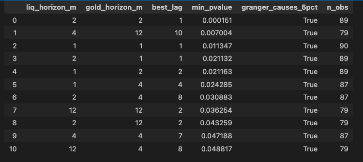 We ran Granger causality tests — an econometric tool that checks whether one variable has predictive power over another — and the results were clear. The liquidity flow from the People’s Bank of China (PBOC), measured over 2-month windows, generates statistically significant returns in gold over that same horizon. The lowest p-value we found was 0.00015 — a significance level that, in practical terms, is hard to dispute.